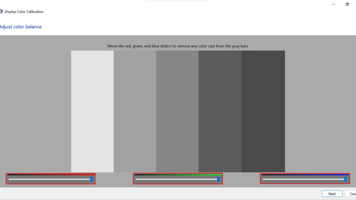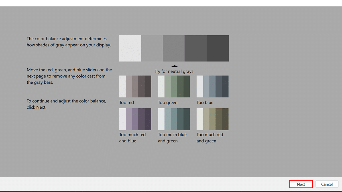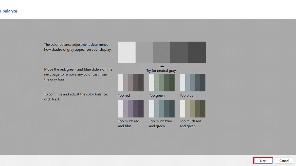 Ulkoisen näytön tapauksessa sisäänrakennettujen säätimien avulla voit säätää punaisia, vihreitä ja sinisiä värejä, kunnes saavut viileämmälle väritasolle, mutta joillakin tietokoneilla ei yleensä ole näyttöohjauksia. Windows 11: n kalibrointityökalun avulla voit kuitenkin vähentää punaisten ja vihreiden värien määrää kiinnittämään lämpimät värit näytölle.
