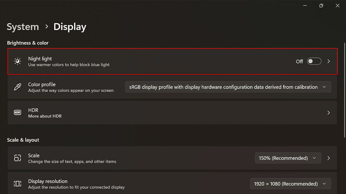Windows 10: ssä ja Windows 11: ssä,YövaloOminaisuus vähentää näytön sinisiä ääniä varovasti, mikä antaa näytölle lämpimämmän ilmeen, joka voi vähentää joitain oireita, jotka vaikuttavat silmäjännityksen tunteeseen, varsinkin kun laitetta käytetään pidennettyinä tunteina.