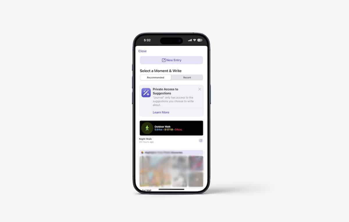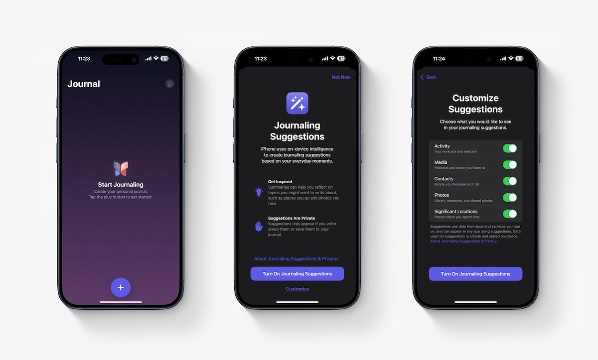 - SeJournal Appon lopulta saatavana iOS 17.2: lla. Sovelluksen avulla käyttäjät voivat dokumentoida ajatuksiaan, tunteitaan ja aktiviteettejaan iPhonsissa tai iPadsissa huolehtiakseen mielenterveydestään. Käyttäjät voivat myös lisätä valokuvia, harjoituksia ja musiikkiasetuksia päiväkirjamerkinnoissaan ja saada aihehdotuksia kirjoittaa. Kaikki sovelluksen tiedot on suojattu passkoodilla tai kasvotunnuksella ja päähän -salauksella. Ehdotuksia käsitellään laitteessa.