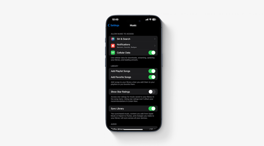 - Lisää suosikkikappaleet vaihtamaanlisätään myös Apple Music -asetuksiin asetussovelluksessa. Kun se on kytketty päälle, se lisää automaattisesti suosikkikappaleita kirjastoosi.