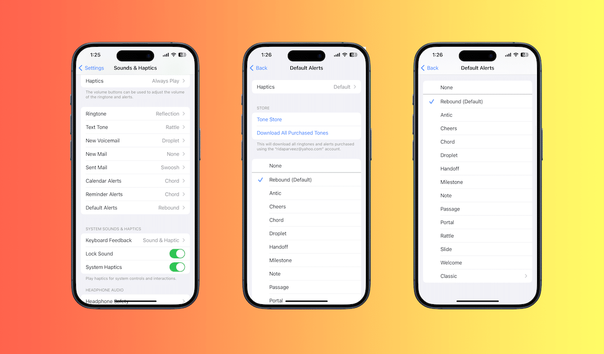 - Hälytysten oletusäänet ilmoituksista.Asetukset -sovelluksen Sounds & Haptics -osiossa lisätään uusi osa ”Oletushälytykset”, jonka avulla käyttäjät voivat valita oletusilmoitusten hälytysäänen, mukaan lukien klassikko, tullit ja muut äänet. Aikaisemmin Rebound oli ainoa oletushälytysääni, jota ei voitu muuttaa.