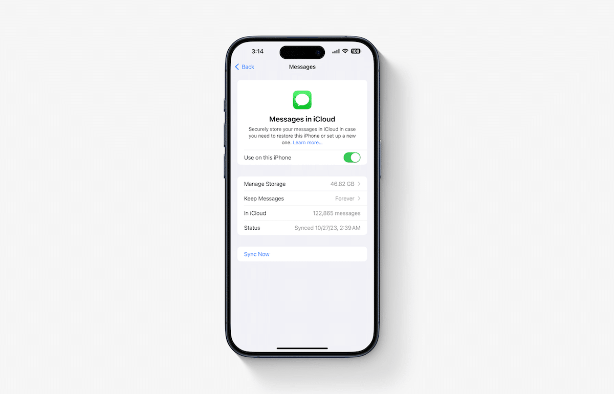 - iCloud on nimennyt viestit uudelleen "viesteiksi iCloudissa"ja luetellaan tiedot ICloudiin synkronoitujen viestien lukumäärästä, viimeisen synkronoinnin ja kokonaisvarastoviestien ajan. Siinä on myös ”Synkronointi nyt” -ominaisuus manuaalisiin päivityksiin.