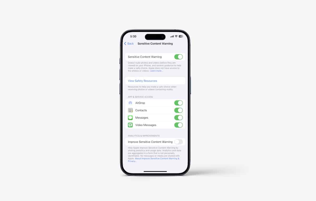- Asetukset -sovelluksen yksityisyys- ja suojausosa laajentaa arkaluontoisia sisältövaroituksia yhteystietoihin.Kun se on käytössä, ominaisuus hämärtää nimenomaiset kuvat, jotka on jaettu nimeltään ROP: n kautta kosketusjulisteissa ja tarroissa.