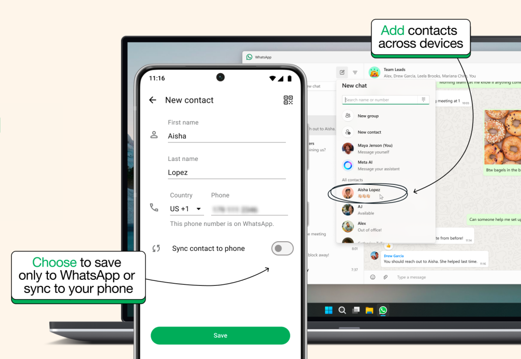 Käyttäjät voivat vaihtaa uuden ”Sync Contact to Phone” -vaihtoehdon yhteystiedon luomisen/lisäysruudun tallentamiseksi yksinomaan WhatsAppiin tai paikallisesti laitteisiinsa.