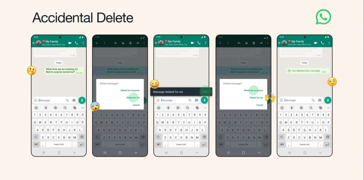 Joulukuussa 2022 Whatsapp julkaisi IOS: n ja Androidin ominaisuuden ”vahingossa tapahtuva poistaminen” käyttäjille kumota “Poista minulle” -vaihtoehto. Aikaisemmin yrittäessään poistaa viestin kaikille keskustelussa, jos käyttäjät "vahingossa" valitsevat 'Poista minulle' -vaihtoehto sen sijaan, että "poistettaisiin kaikille", heillä ei ollut mitään keinoa oikein, ja ei -toivottu viesti pysyi vastaanottajan kanssa.