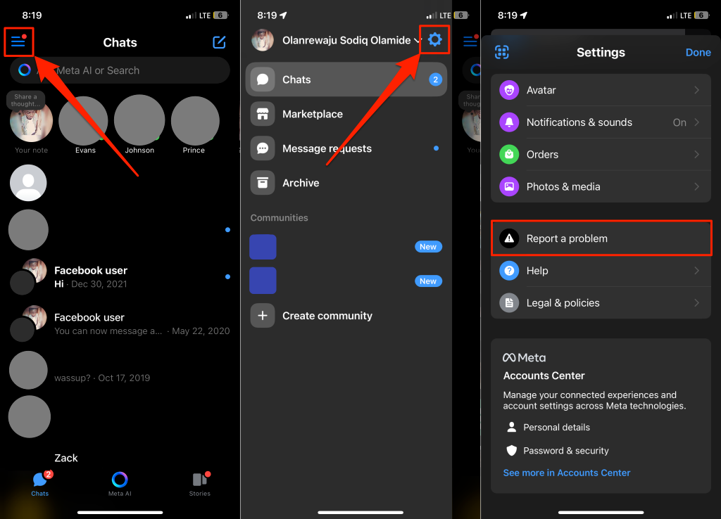 - Käynnistä Messenger ja napauta valikkokuvaketta vasemmassa yläkulmassa. Napauta seuraavaksivarusteet-Asetukset -kuvakeOikeassa yläkulmassa ja valitseIlmoita ongelma.