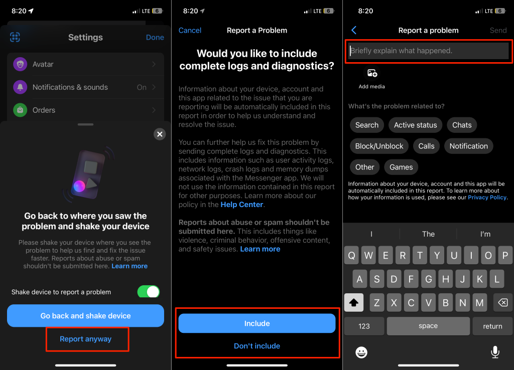 - NapauttaaRaportoi joka tapauksessaja valitseSisältääLisää tietoja älypuhelimestasi ja tilistäsi raporttiin. ValitaÄlä sisälläjättää nämä tiedot pois.