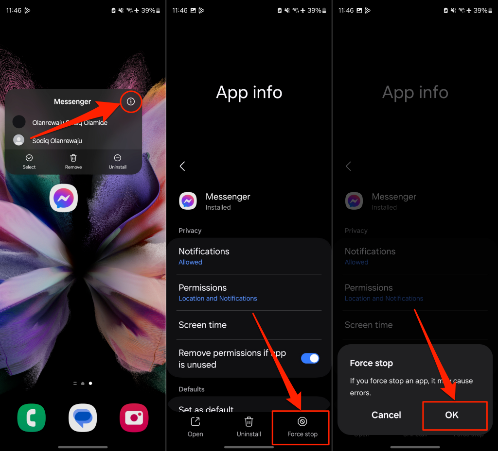Messengerin sulkeminen ja uudelleen avaaminen voisi saada sovelluksen toimimaan uudelleen oikein. Jos käytät Android -puhelinta, Force Stop/Sulje sovellus sen sijaan.