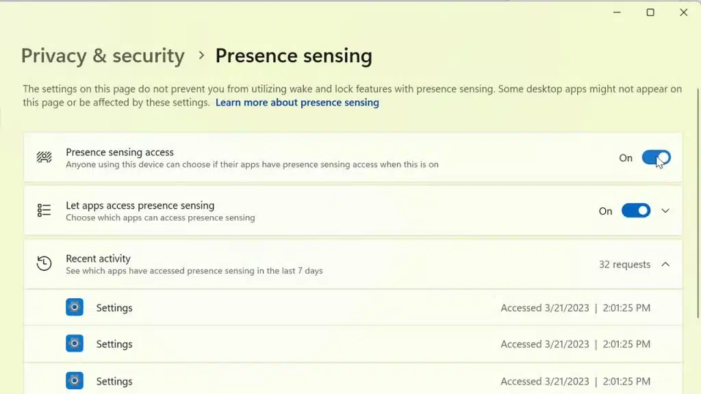 Käyttäjät voivat tarkistaa, mitkä sovellukset tuntevat läsnäolonsa Windowsin tietosuoja -asetusalueellaAsetuksetsovellus, johon pääseeAsetukset-Yksityisyys ja turvallisuus-Läsnäolotunnistus. Täältä käyttäjät voivat vaihtaa, mihin sovelluksilla on pääsy erikseen, tai kytkeä ominaisuus kokonaan pois päältä.