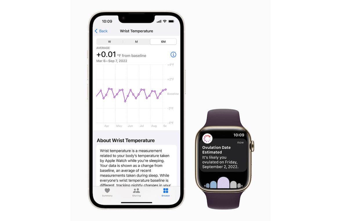 Uudet Apple Watch Series 8 ja Apple Watch Ultra -näytön ja näytön alla olevat kaksi lämpötila-anturia käyttävät käyttäjien ranteen lämpötilaa viiden sekunnin välein heidän nukkuessaan. Seuraavaksi edistyneet algoritmit käyttävät näitä tietoja luodakseen jokaisesta yöstä koosteen, joka tallennetaan Terveys-sovellukseen, jotta käyttäjät voivat tarkastella suhteellisia muutoksia peruslämpötilaan verrattuna.