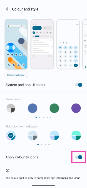 Mennä jhkAsetukset> Lukitusnäyttö ja taustakuva> Väri ja tyylija sammuta vaihtokytkin 'Levitä väri kuvakkeisiin'.
