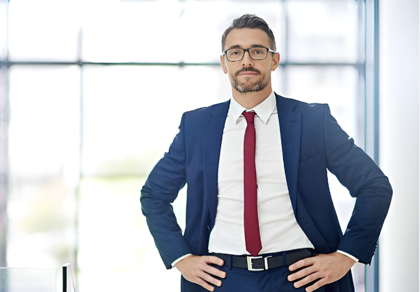 Se on paras asento yrityskuvauksiin. Seiso paikallaan ja aseta molemmat kätesi lantiolle. Tämä voi osoittaa, että olet itsevarma ja seisot omalla paikallasi.