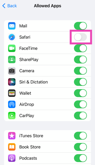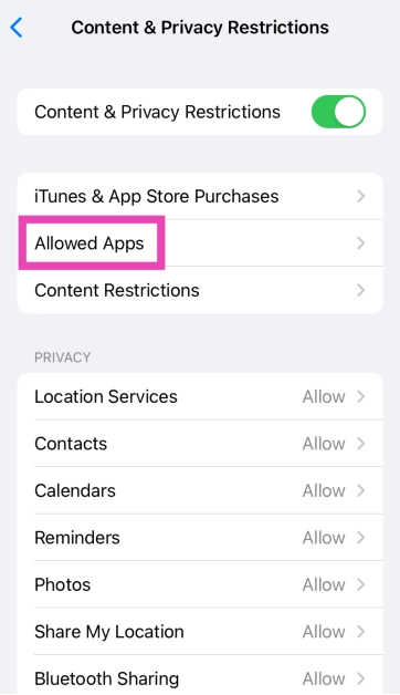 Mennä jhkAsetukset> Sisältö- ja tietosuojarajoitukset> Sallitut sovelluksetJa kytke kytkin kytkin päälle sovelluksen vieressä, jonka haluat rajoittaa.