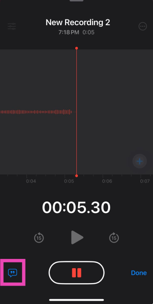 Napsauta äänimuistiosovelluksen tietue -painiketta, pyyhkäise paneeliin laajentaaksesi sitä ja paina lainauskuvaketta nähdäksesi live -transkription.