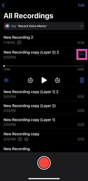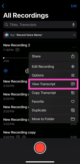 Luo äänitallennus iPhonen äänimuistio -sovelluksella ja valitse sitten tallennus ja paina ellipsejä. Valitse 'Näytä transkriptio' vaihtoehtojen luettelosta.