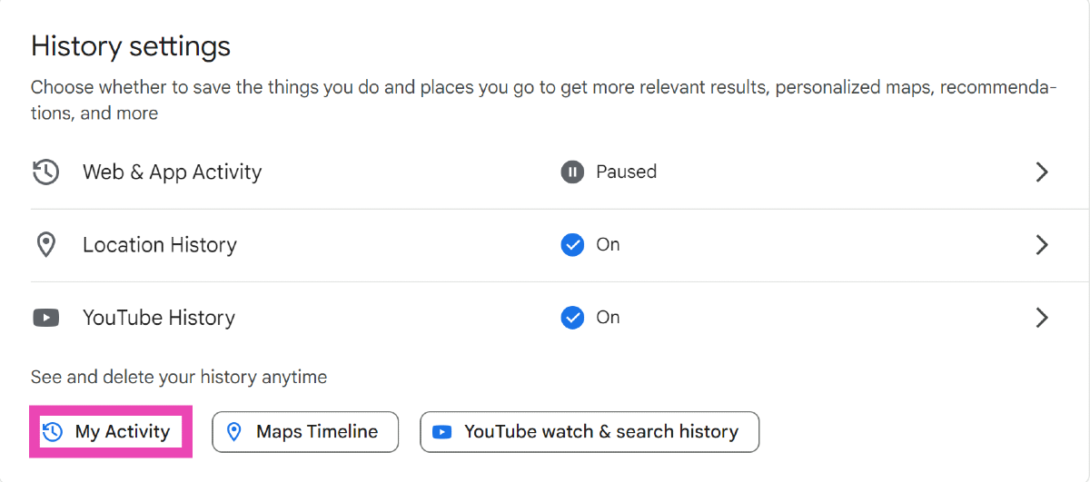 Google -tilisi tallentaa verkko- ja sovellushistoriasi, sijaintihistoriasi ja YouTube -historiasi. Voit poistaa ne Google -tilisi 'Aktiviteetin' sivulta.