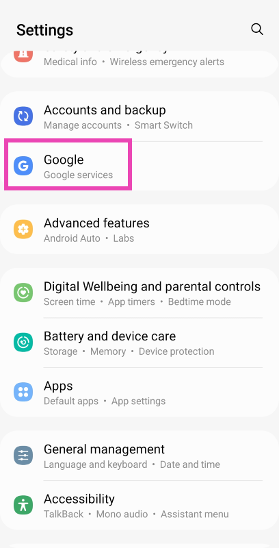 Vaihe 1:Mennä jhkAsetuksetja valitseGoogle.