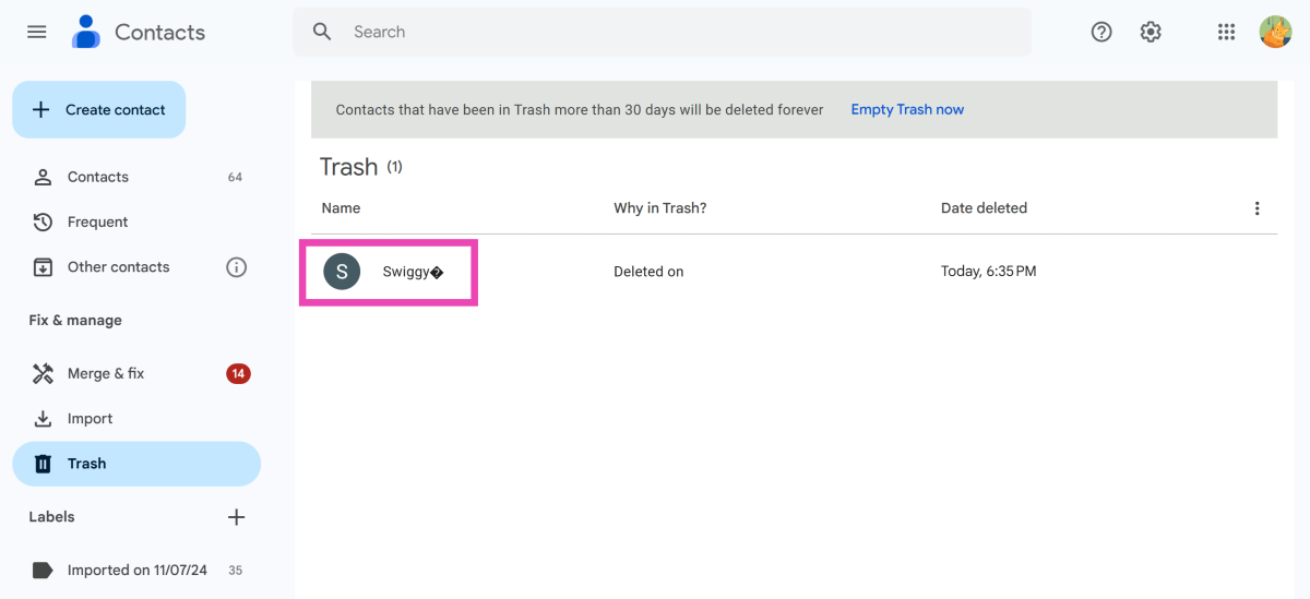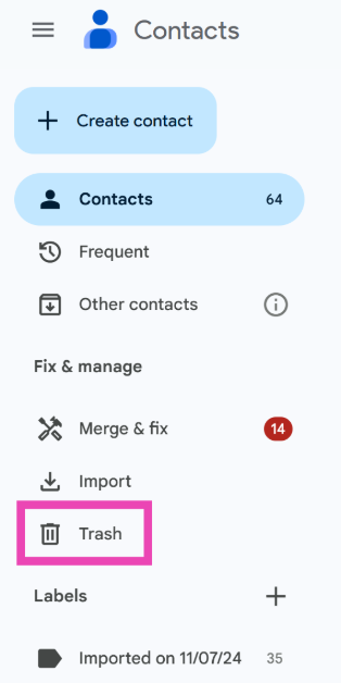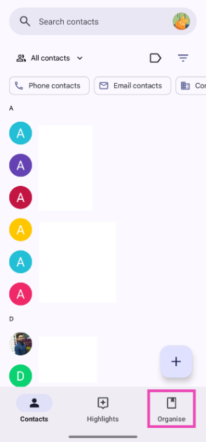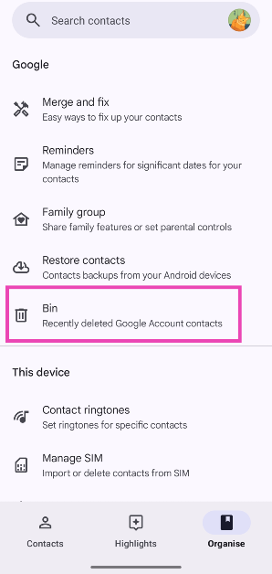 Google -yhteystietojen kierrätysastia on 'Organize' -välilehdessä.