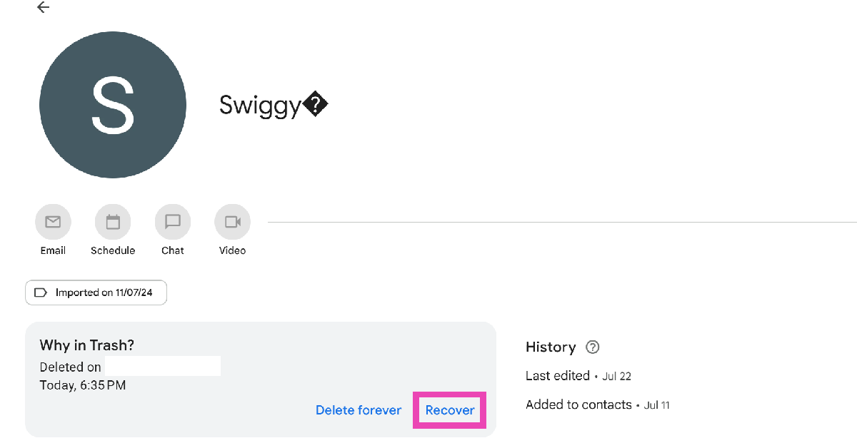 Avaa Google Contacts -verkkoportaali tietokoneellasi, napauta 'roskat', valitse yhteystieto ja paina 'palauta'.