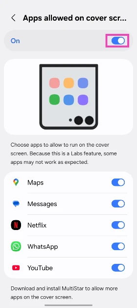 Mennä jhkAsetukset> Lisäasetukset> Laboratoriot> Kansinäytöllä olevat sovelluksetja kytke kytkin päälle. Pyyhkäise alas ja kytke kytkentäkytkimet päälle YouTuben ja Netflixin vieressä. Kun se on valmis, voit käyttää kahta sovellusta kannen näytöllä.