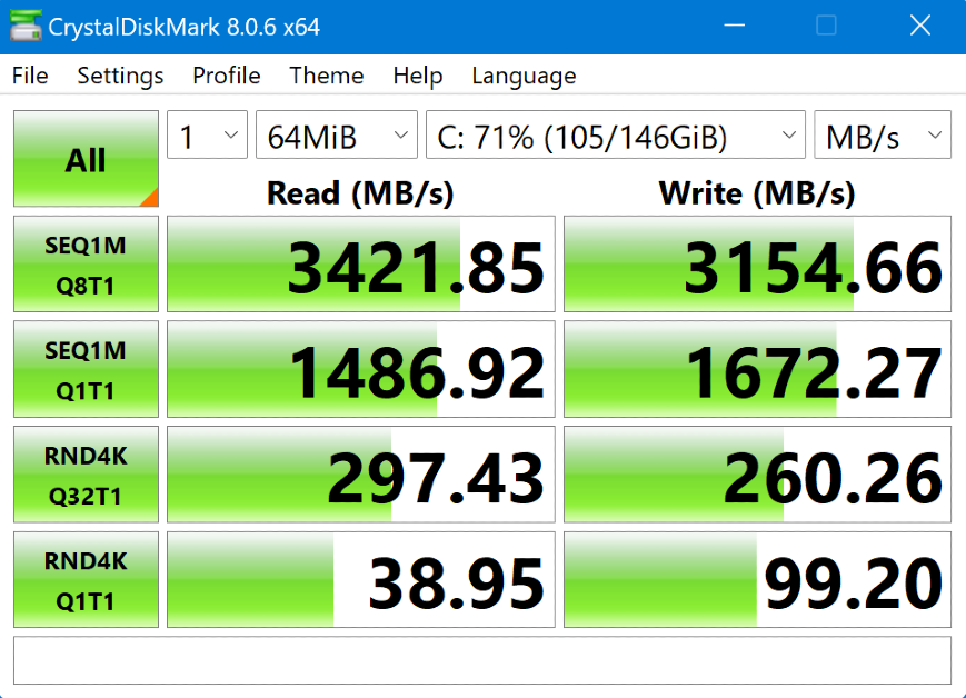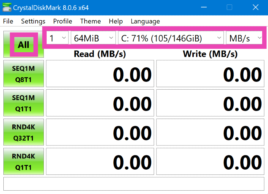 Käynnistä CrystalDiskMark ja valitse levyn nimi, ajojen määrä ja tiedostokoko ylävalikosta. Suorita testi valitsemalla Kaikki. Kun testi on valmis, SSD:n nopeus näkyy näytöllä.