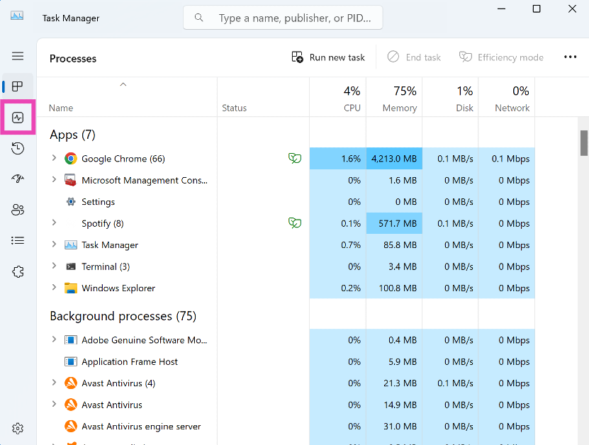 Vaihe 2:Siirry kohtaanSuorituskyky-välilehti sivupalkissa.