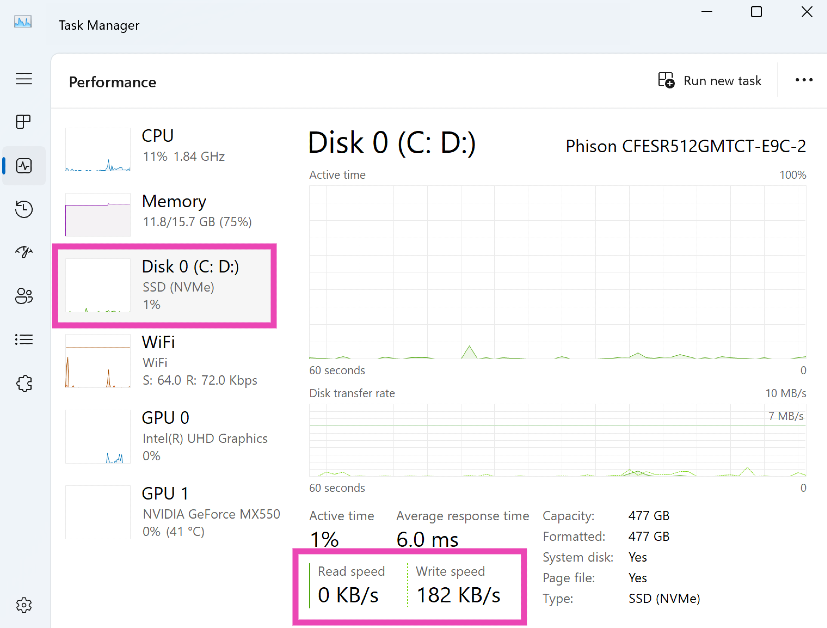 Tarkista SSD:n nopeus Task Managerin avulla