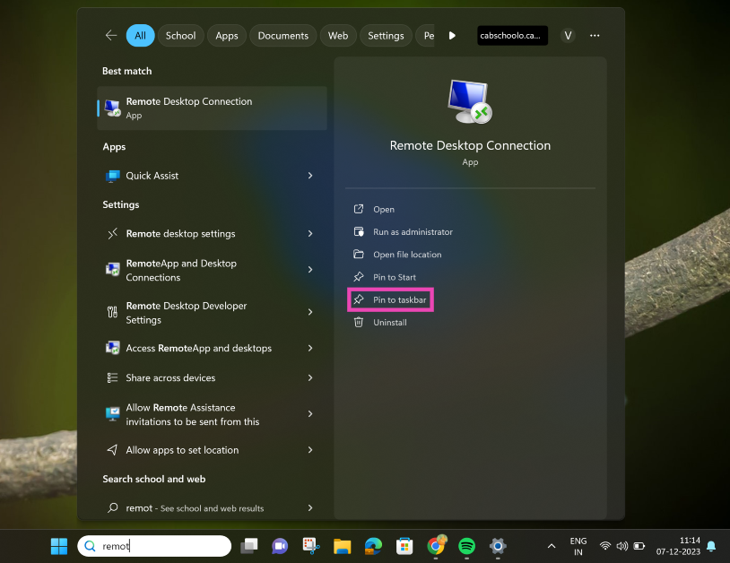 Kirjoita Etätyöpöytäyhteys tehtäväpalkin hakukenttään ja valitse Pin to Tehtäväpalkki APP -asetuksista.