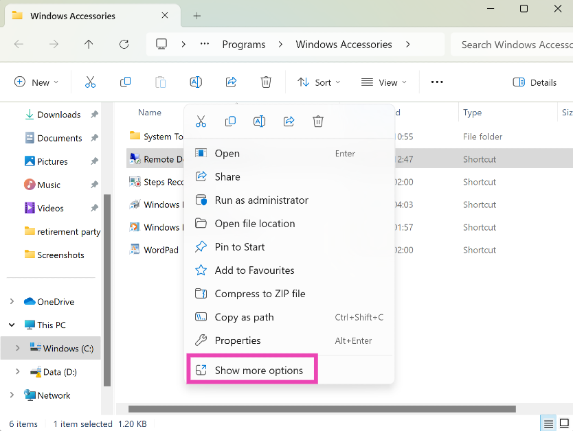 Vaihe 3: Napsauta hiiren kakkospainikkeellaetäpöytäyhteydessä ja valitseNäytä lisää vaihtoehtoja.