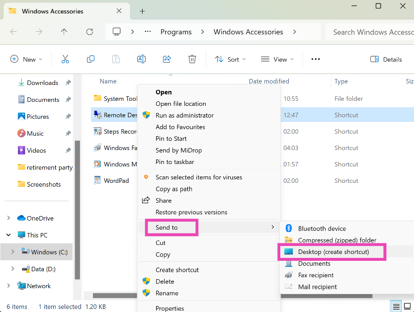 Voit luoda anapsauttamalla hiiren kakkospainikkeellaan sen tiedoston sijaintia ja valitsemallaNäytä lisää vaihtoehtoja> Lähetä> työpöydälle. Vaihtoehtoisesti voit myös napsauttaa hiiren kakkospainikkeella itse työpöydällä ja valitaUusi> pikakuvake. Kirjoita seuraavaan ikkunaan RDC: n tiedoston sijainti ja painaSeuraava.