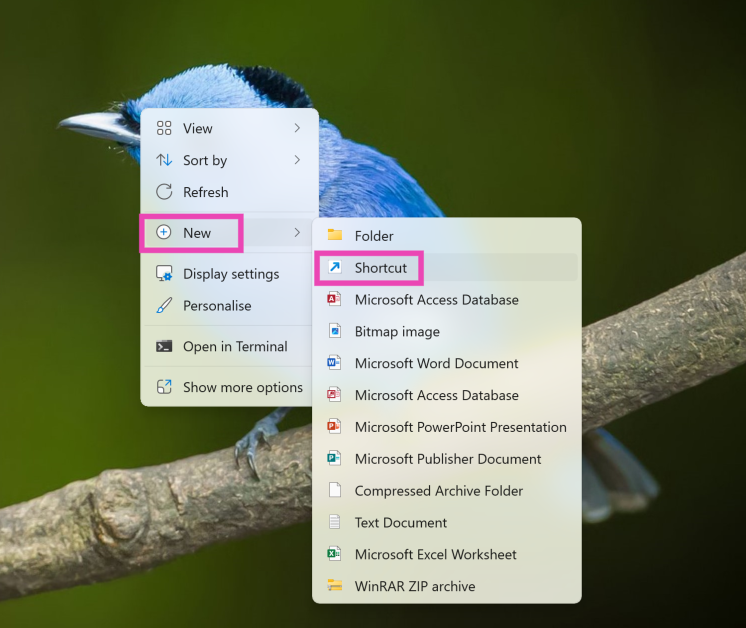 Vaihe 1: Napsauta hiiren kakkospainikkeellamissä tahansa työpöydällä ja valitseUusi> pikakuvake.