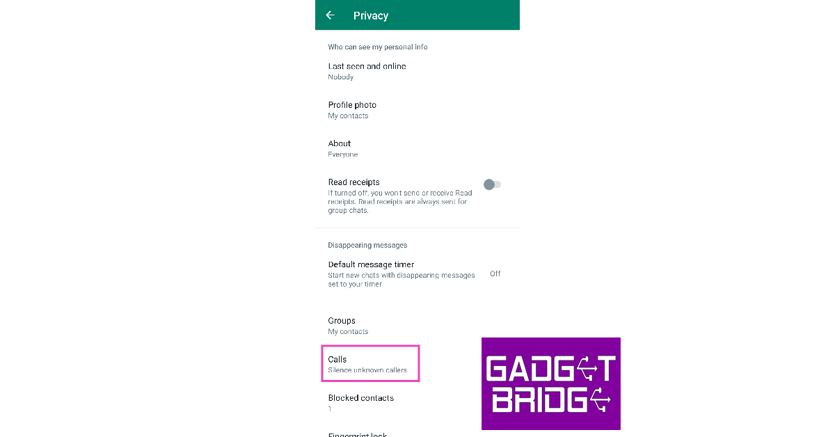 Vaikuttaaksesi WhatsApp -puhelut tuntemattomista numeroista, meneWhatsApp> Asetukset> Tietosuoja> Puhelutja kytke kytkinkytkin päälle 'hiljaisuuden tuntemattomien soittajien'.