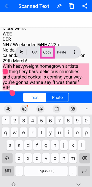 Vaihe 2:TheKopioi teksti kuvastavaihtoehdon pitäisi ilmestyä näytön alareunaan.Napautasen päällä.