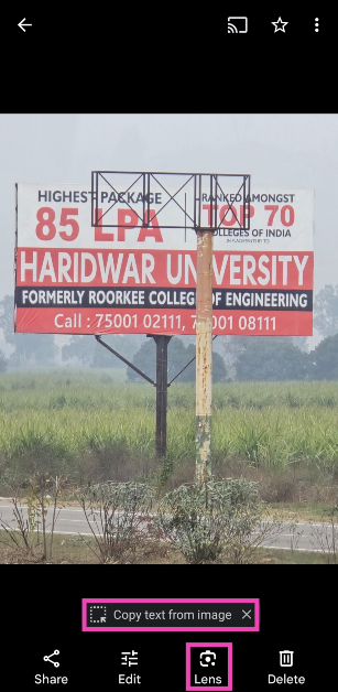 Google Kuvat ja Google Lens -sovellukset voivat poimia tekstiä mistä tahansa puhelimesi galleriassa olevasta kuvasta. Kopioi teksti painamalla kuvan alla olevaa linssikuvaketta.