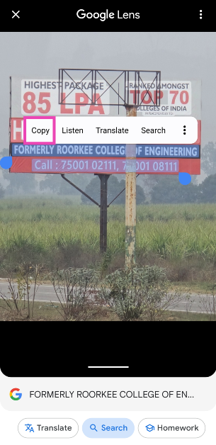 Avaa kuva Google Kuvat -sovelluksessa, paina linssi-vaihtoehtoa alareunassa ja valitse kuvassa oleva teksti. Napsauta ponnahdusvalikosta Kopioi.