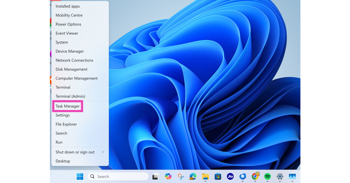 Vaihe 1: Napsauta hiiren kakkospainikkeellaseWindows -kuvaketehtäväpalkissa ja valitseTehtäväpäällikkö.