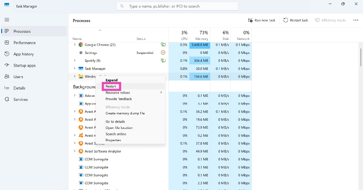 Vaihe 3:Napsauta hiiren kakkospainikkeellaWindows Explorerja valitseKäynnistää uudelleen.