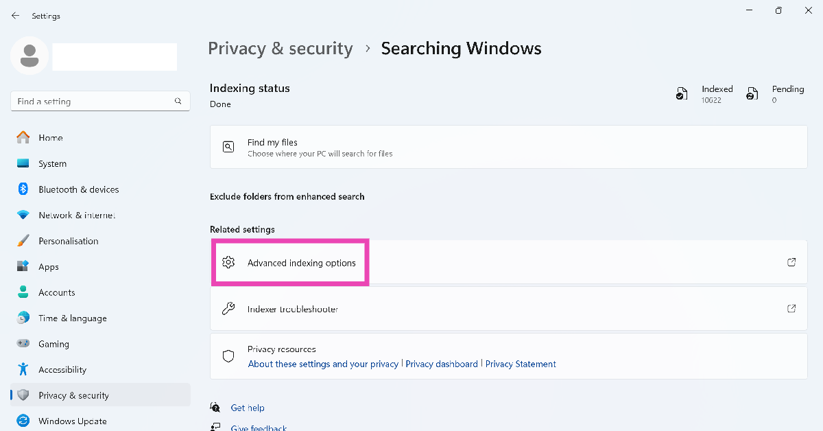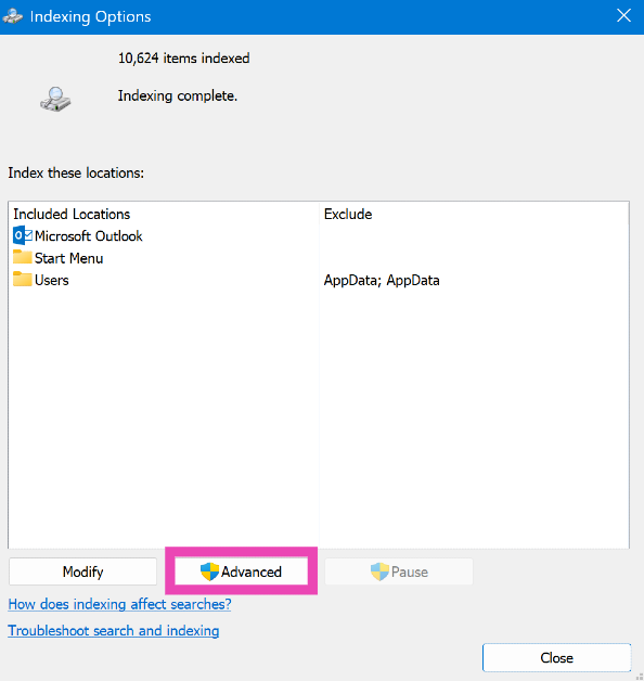 Vaihe 3:Vieritä alas ja valitseEdistyneitä indeksointivaihtoehtoja.