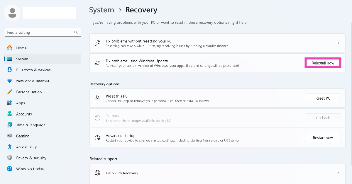 Mennä jhkAsetukset> Järjestelmä> Palautusja napsauta 'Asenna nyt' -sivustolle 'Korjaa ongelmat Windows Update -sovelluksella'.