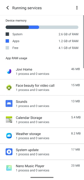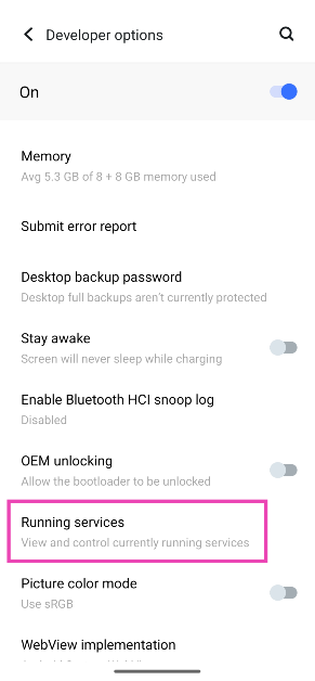 Siirry kehittäjätilaan napauttamalla puhelimesi rakennusnumeroa 7 kertaa. Siirry sitten kohtaanKehittäjäasetukset>Käynnissä olevat palvelutnähdäksesi, mitkä sovellukset käyttävät tällä hetkellä laitteesi RAM-muistia.
