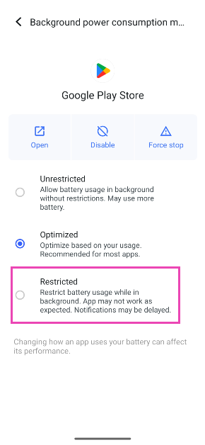 Jos sinusta tuntuu, että sovellus kuluttaa paljon akkua, siirry osoitteeseenAsetukset> Sovellukset, valitse se, napauta 'Akku' ja valitse 'Rajoitettu'.