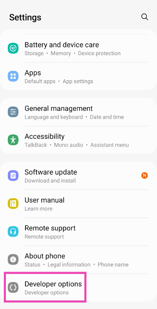Vaihe 4:Siirry takaisin kohtaanAsetukset, vieritä kokonaan alas ja valitseKehittäjävaihtoehdot.