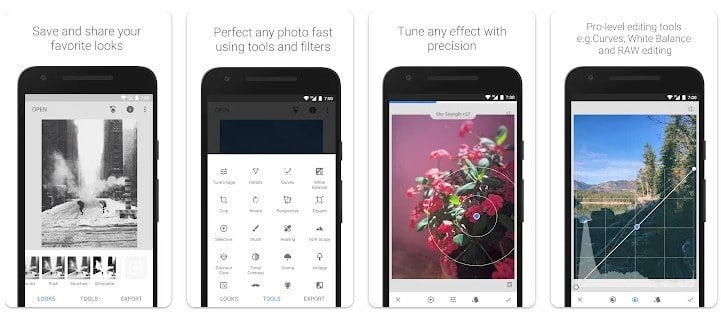 - Snapseed tarjoaa kattavan joukon työkaluja ja suodattimia, joiden avulla voit säätää valokuvien eri näkökohtia.