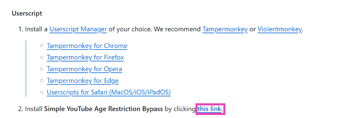 Vaihe 2:MennäYksinkertainen YouTube -ikärajoituksen ohitussivuGitHubissa ja vieritä alasUserscript -osa.