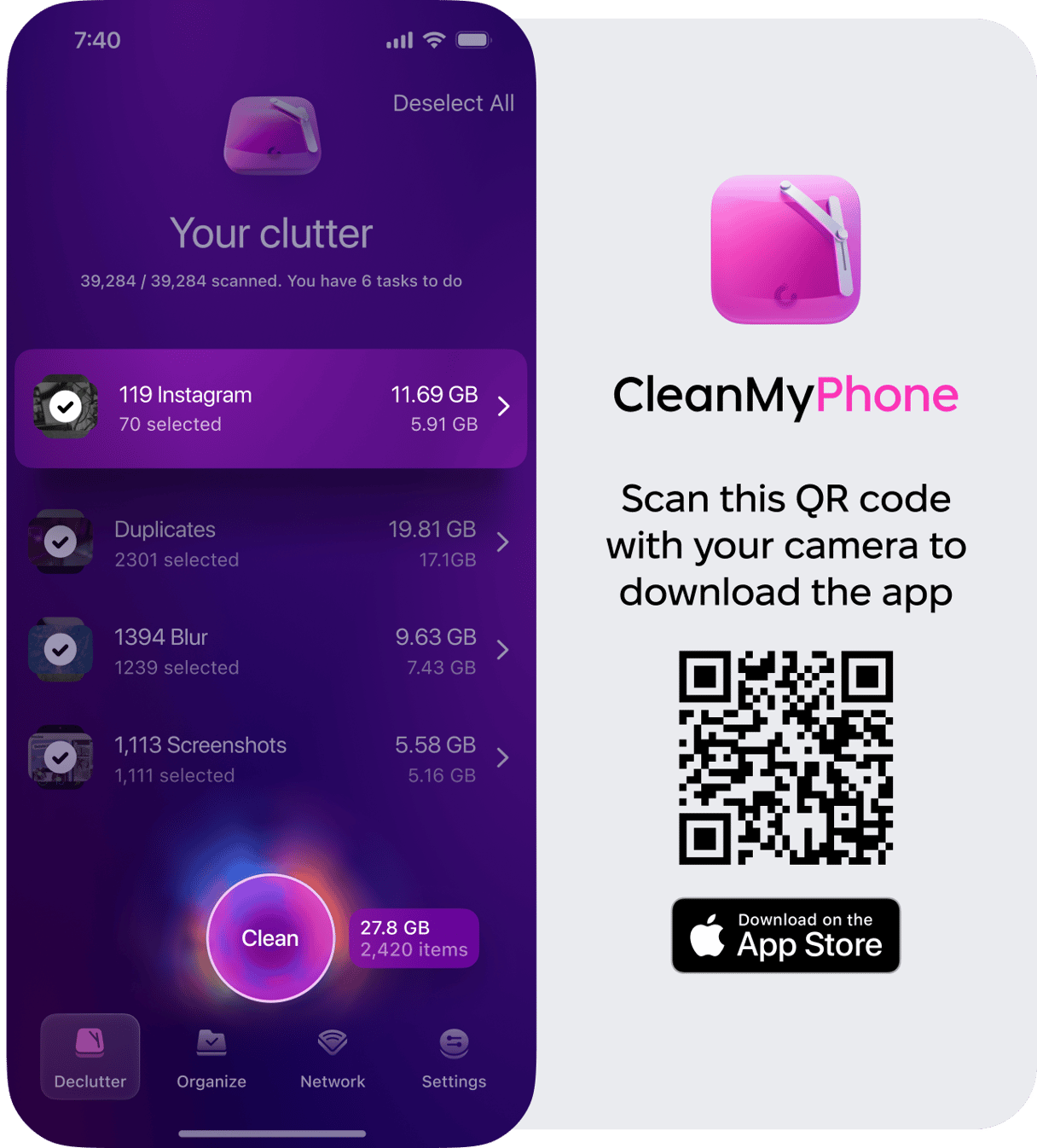 Täydellisen selfien sieppaaminen vaatii paljon yrityksiä, ja iPhonen avaruus on helppo loppua prosessissa. Vapauta säilytysCleanmy® -puhelin, sovellus, joka löytää samanlaisia kuvia, kaksoiskappaleita ja muuta sotkua, jonka voit poistaa.