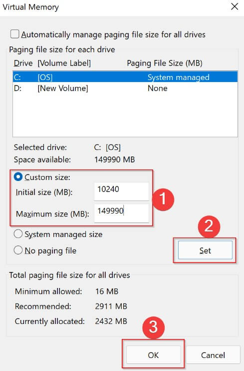 Riittämätön RAM -muistia voi myös aiheuttaa ”Windows 11 Flefzes -yrityksen” ongelman. Siksi voit säätää virtuaalimuistia aina, kun kohtaat tämän ongelman. Näin voidaan mukauttaa virtuaalimuisti.