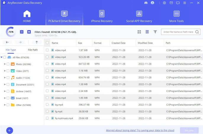 Olemme suositelleet loistavia tapoja korjata"Windows 11 jäätyy"Aihe, ja voit kokeilla kaikkia tapoja purkaa asia. Jos ”Windows 11: n jäädyttäminen satunnaisesti” -kysymyksen syntyminen aiheuttaa tietojen menetystä, voit hakea menetetyt tiedot hankkimalla AnyRecoverin palvelut. Sen avulla voit hakea menetetyt tiedot melkein kaikesta tallennustilasta ja vie vain hetken ennen tietojen palauttamista takaisin.