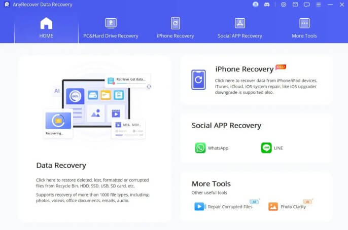 Kadonneiden tietojen hakemisesta tonnilta tallennuslaitteista yli 1000 tietotyypin palauttamiseen, kaikki -uusinta on helposti useimpien ihmisten ensisijainen tavoite. Tämän lisäksi AnyRecover kehottaa nopeaa skannausnopeutta ja keksii korkeimman palautumisnopeuden, mikä tarkoittaa, että se ei petä sinua.
