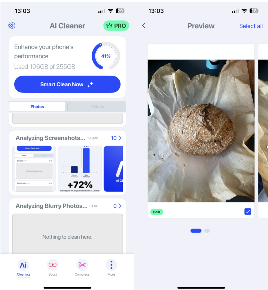 Molemmat sovellukset on suunniteltu auttamaan tilaa vapauttamaan, mutta ne lähestyvät sitä eri tavalla.AISiivoojaPitää asiat nopeana ja yksinkertaisena yhden napsautuksen skannauksilla ja automaattisilla ehdotuksilla, keskittyen enimmäkseen valokuviin ja videoihin. Se sopii hyvin nopeaan puhdistukseen, jolla on minimaalinen tulo.