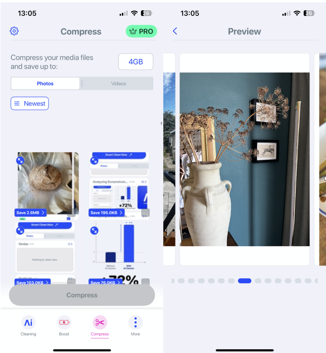 Jos etsit enemmän hallintaa siitä, mikä poistetaan,PuhdasTarjoaa selkeämmän asettelun älykkäällä mediakategorialla, vierekkäin vertailuja kaksoiskappaleisiin ja videon pakkaamiseen säädettävillä asetuksilla. Yksi lisäominaisuus, joka erottuu, on sen vuorovaikutteinen tallennuskatkaisu, joka antaa sinulle visuaalisen yleiskuvan siitä, mikä on tilaa, jota AI Cleaner ei sisällä. Voit myös suorittaa täydelliset skannaukset ilman päivittäisiä käyttökorkkeja tai jatkuvia päivityskehotteita, mikä helpottaa säilyttämisen pysymistä ajan myötä.